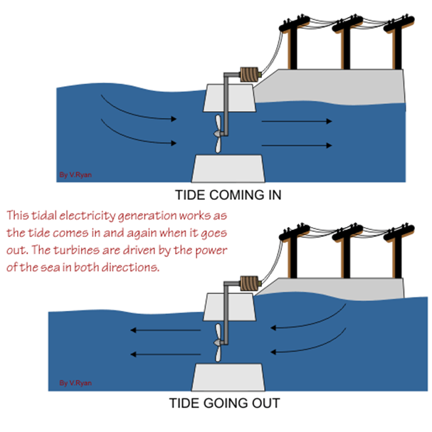 Walaupun teknologi gelombang tidal bukan merupakan teknologi yang baru, namun masih menjadi rekomendasi dalam pembangkitan listrik ramah lingkungan, Gelombang tidal biasanya dihasilkan dari pasang surutnya air laut yang dapat diprediksi. Berbeda dari wave star yang menggunakan langsung gerakan gelombang laut untuk menghasilkan putaran di generator, energi tidal dihasilkan dengan membuat penampungan (barrage) atau reservoir untuk menampung air laut yang sedang pasang. Ketika air tersebut kembali ke laut, celah antara reservoir dengan laut yang memiliki turbin akan berputar. Putaran tersebut kemudian menggerakkan generator dan akhirnya menghasilkan listrik.