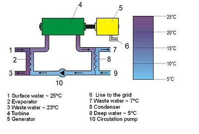 Pada siklus tertutup, sistem menggunakan fluida dengan titik didih rendah seperti amonia untuk memutar turbin. Air permukaan laut yang hangat dipompa melewati heat exchanger tempat amonia tadi diuapkan. Fluida akan berubah menjadi uap dan mengalami peningkatan tekanan. Uap bertekanan tinggi ini kemudian dialirkan ke turbin yang berputar sehingga menghasilkan listrik. Uap tersebut kemudain kembali didinginkan dengan air dari dasar laut yang dingin dan uap tersebut menjadi embun. Fluida kembali dididihkan dan proses berlangsung secara berulang dan terus menerus.