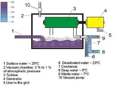 Sedangkan pada siklus terbuka, air laut yang hangat dimasukkan ke dalam tangki bertekanan rendah dan menguap. Uap ini kemudian menggerakkan turbin. Air laut yang menguap akan meninggalkan mineral seperti garam dan lainnya, sehingga pada sistem terbuka ini hasil dari penguapan dapat digunakan untuk menghasilkan air tawar dan bisa digunakan untuk irigasi.